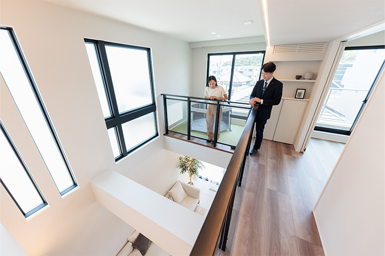 2階からは、リビングを一望することができます。2階の吹き抜け横には、秘密基地感覚のホームオフィスを配置。