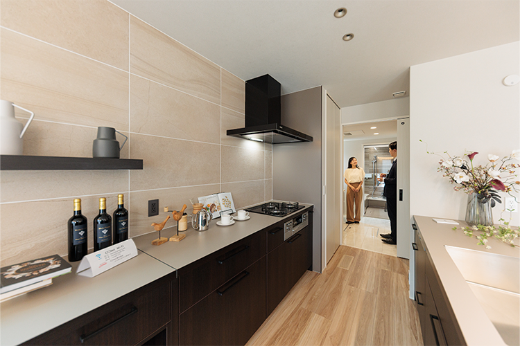 キッチン、洗面室、浴室が一直線に並んだ無駄のない動線が特徴。
