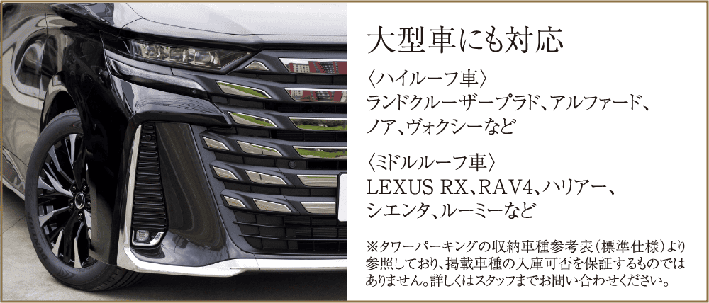 車高や重量を心配することなく駐車場区画を利用可能。また幅広車両に対応する専用区画もご用意し、さまざまな車種に対応。