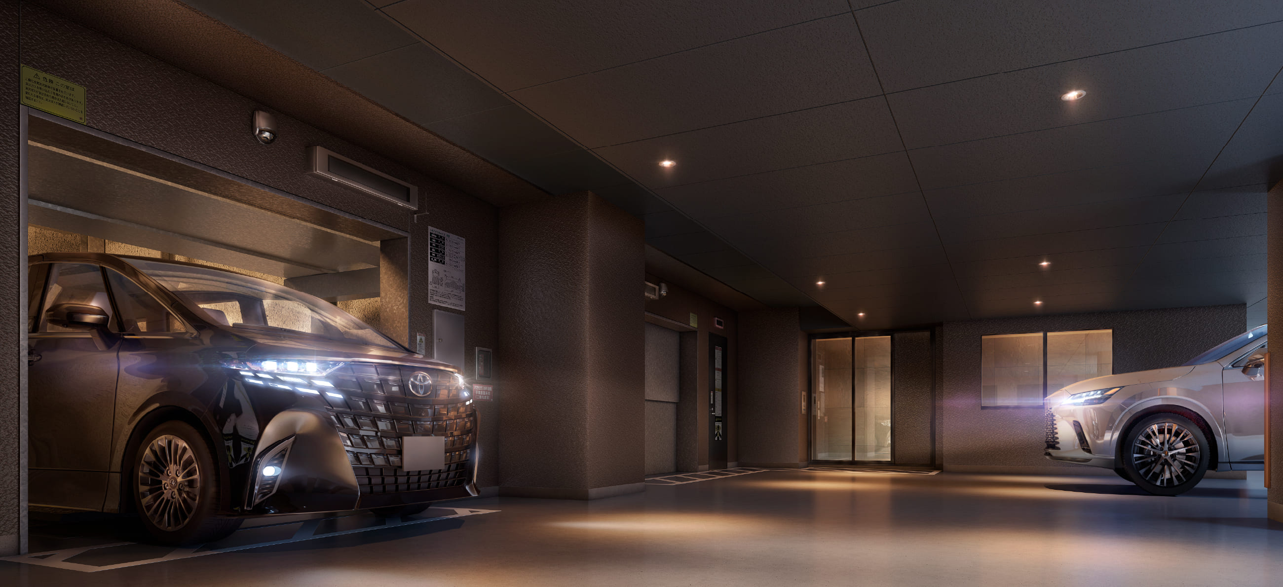 前向きで入庫しても庫内で車両が回転し、出庫する時には再度前向きで出られる最新のタワーパーキングを採用。待ち時間や乗り降りの際、人も車も風雨にさらされることがない上、出庫もスピーディーに。