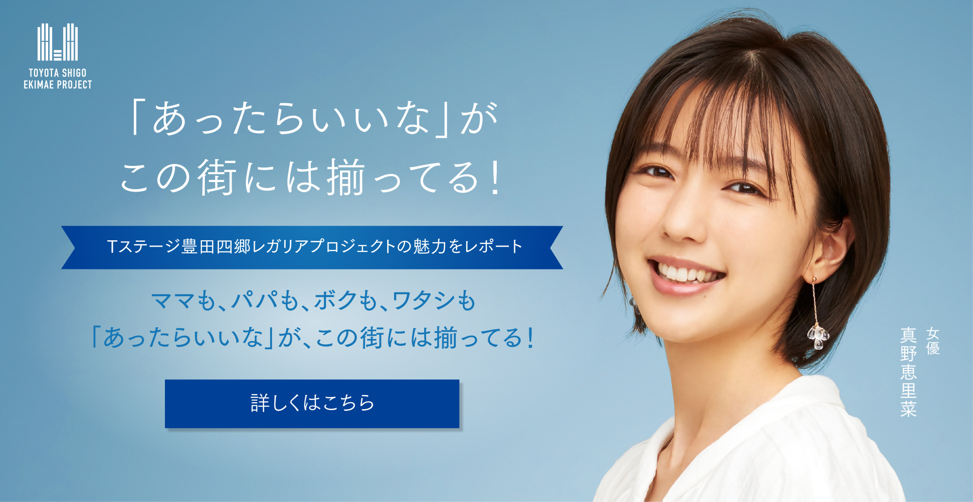 - Tステージ豊田四郷レガリアEAST 「プロジェクトの魅力レポート」ページを公開いたしました。女優の真野恵里菜さんが特設ページにて四郷駅前マンションの魅力をご紹介します。