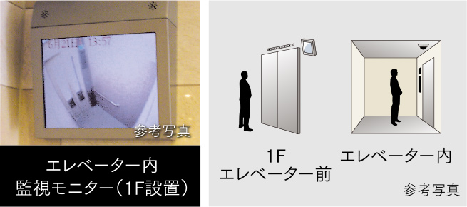 エレベーター内にはカメラを設置。1階エレベーターホールに設置されたモニターにカメラの映像を映し出すことで、他人と乗り合わせる不安を軽減します。