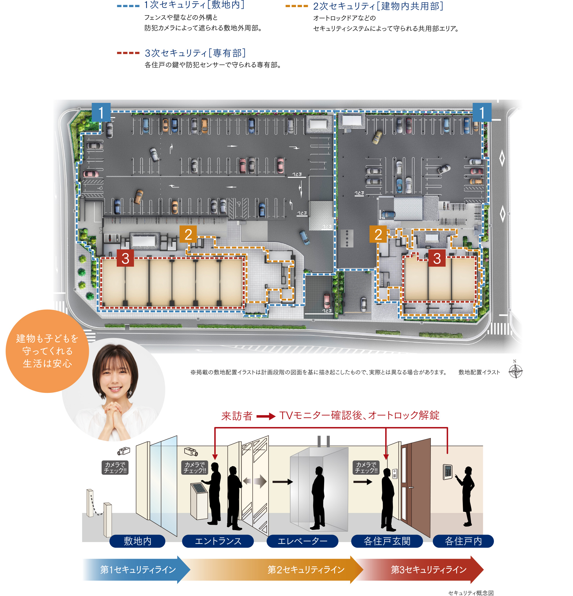 敷地内の安全確保のために、専有部も含めた3重のセキュリティラインを設けて、安心の暮らしを守ります。